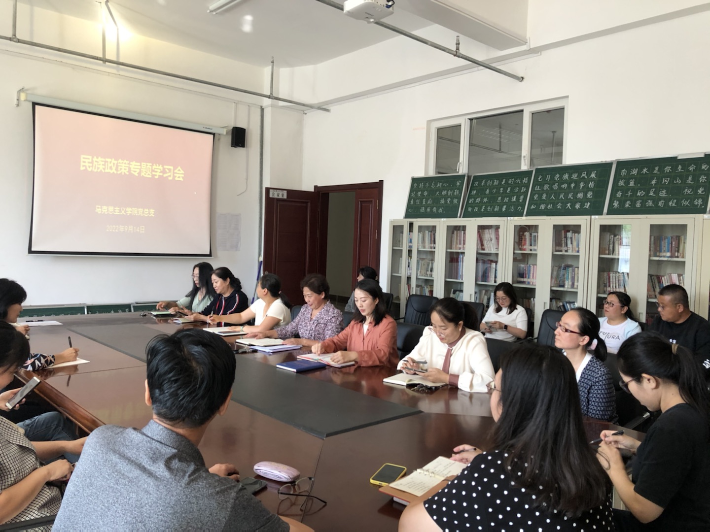 深入开展铸牢中华民族共同体意识教育,促进民族团结进步,2022年9月14日,bat365正版唯一官网党总支理论学习中心组扩大学习会在崇文楼B123会议室召开专题学习。会议由党总支书记刘凤琴主持,学院全体教师参加。会上集中学习了《内蒙古自治区促进民族团结进步条例》、《内蒙古自治区教育条例》和《中华人民共和国国家通用语言文字法》等法律法规,同时要求各位老师自学《民族区域自治法》。