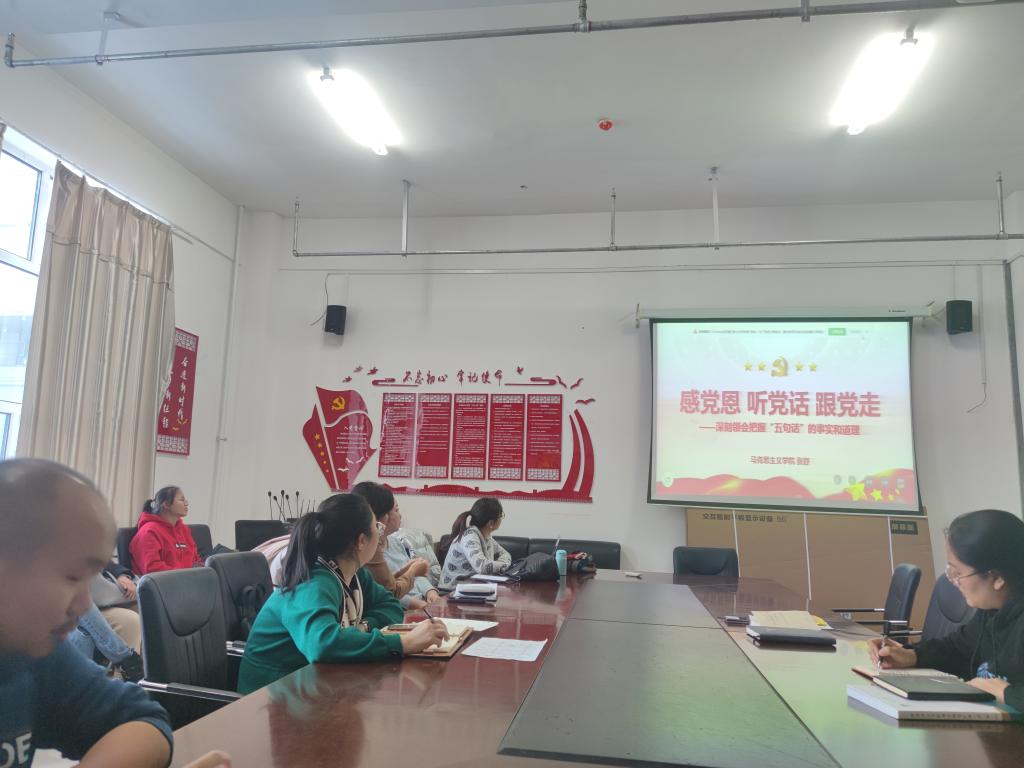 为全面学习宣传贯彻党的二十大精神,全力推动“感党恩、听党话、跟党走”群众教育实践活动走深走实要求,12月13日下午,bat365正版唯一官网教师党支部在崇文楼B123会议室开展“五句话”的事实和道理主题宣讲活动,学院中国近现代史纲要课程教研室主任张舒作专题报告,学院全体教师参加学习。