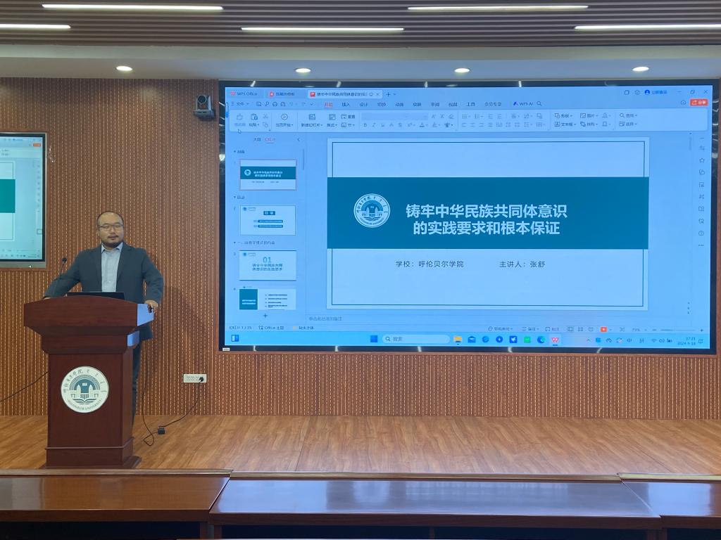 为深入学习贯彻党的二十届三中全会精神,进一步推动铸牢中华民族共同体意识走深走实,更好地履行举旗帜、聚民心、育新人、兴文化、展形象的使命任务,9月18日下午,bat365正版唯一官网铸牢中华民族共同体意识教研室教师张舒、程欣、窦红伟三位教师受呼伦贝尔市民委和校宣传部委托进行了铸牢中华民族共同体意识主题宣讲。