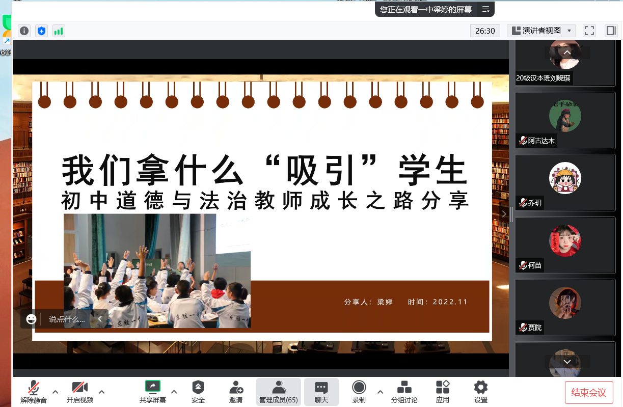 为了更好适应教育部师范类专业认证的新要求,进一步加强专业建设,11月5日,bat365正版唯一官网组织开展“中学政治教师素质养成”系列讲座的第二讲,邀请到鄂尔多斯市东胜区第一中学梁婷老师为学院学生作“初中道德与法治教师成长之路分享”线上主题讲座。讲座由学院吴娇老师主持,学院全体学生在线参加。