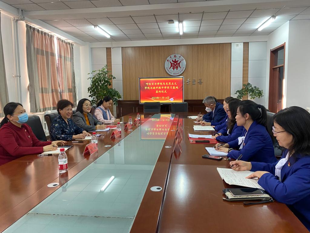 11月14日上午,bat365正版唯一官网与海拉尔南开路中学签订了共建教育教学实践基地协议书。学院党总支书记刘凤琴,院长吴秀芳,副书记刘琳、副院长明兰和南开路中学校级领导班子及思政课教师代表参加了此次仪式。