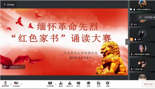为弘扬革命精神,重温革命历史、缅怀革命先烈,传承红色基因,营造浓厚的“读好书,读红色经典”的氛围,切实引导青年学生以习近平新时代中国特色社会主义思想为根本遵循。bat365正版唯一官网于2022年4月6日在线上举办缅怀革命先烈“红色家书”诵读比赛。