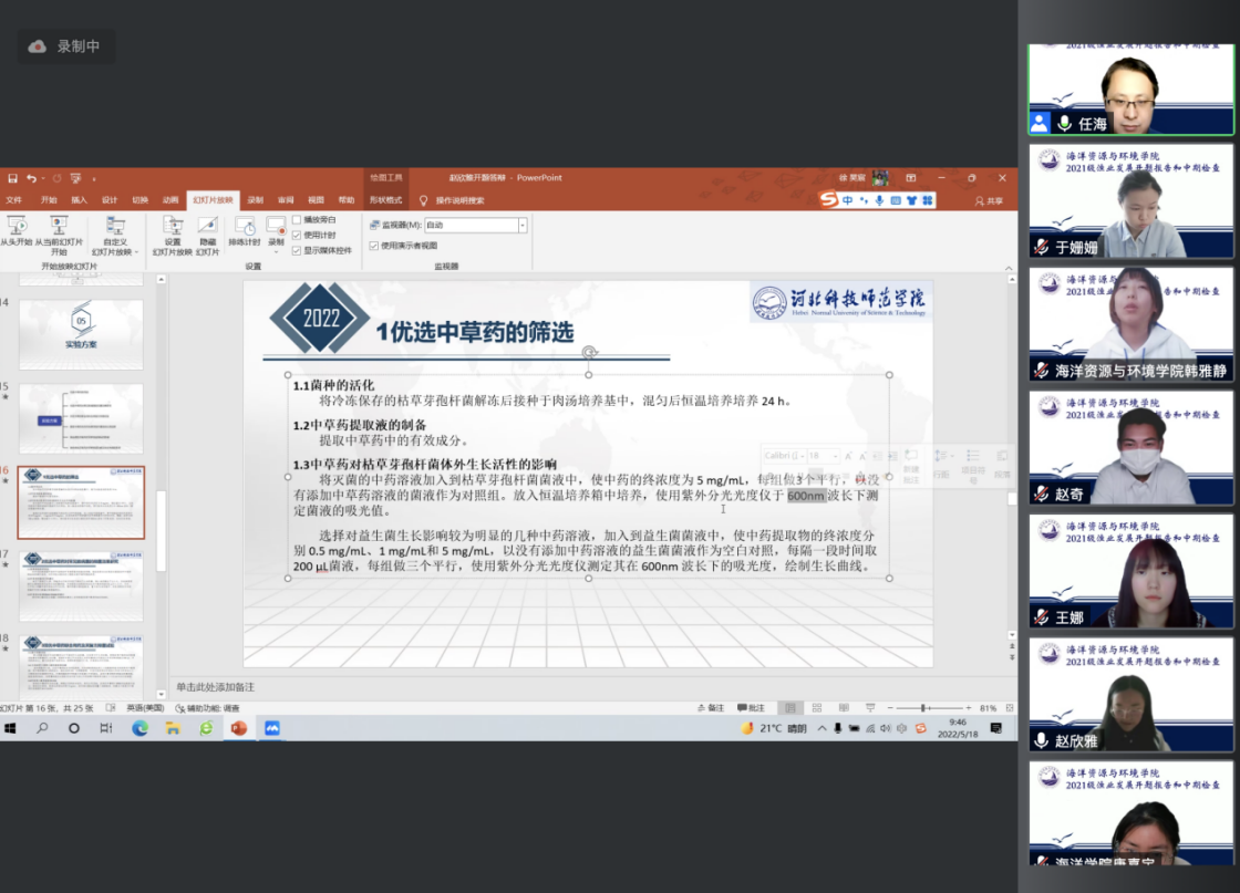 2022年5月18日上午,beat365召开2021级渔业发展专业学位研究生中期检查暨开题报告会。该届渔业发展专业研究生是beat365自成立以来首批招收的硕士研究生,学院对研究生的论文开题工作非常重视,成立由任海副教授作为组长,高桂生、靳晓敏和于姗姗作为组员的考核小组,21级全体硕士研究生通过线上方式参与此次开题答辩。