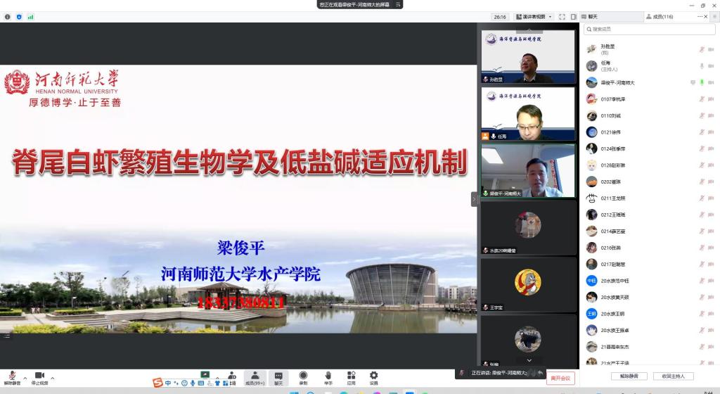 2022年10月23日上午,beat365正版唯一官网必一三期海洋论坛活动在腾讯会议线上进行,本次活动邀请了优秀校友河南师范大学梁俊平博士给beat365师生做学术报告。会议由水产科学教学部任海博士主持,水产科学教学部全体教师、渔业发展硕士研究生以及海洋学院本科生300余人收听了报告,学院党委副书记、副院长孙胜显出席会议。