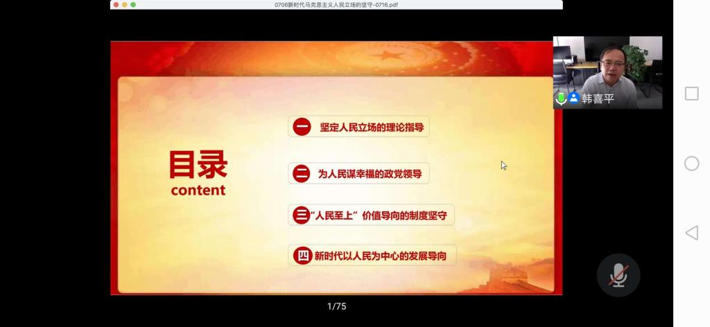 7月16日下午,bat365正版唯一官网“毛泽东思想和中国特色社会主义理论体系概论”课程组全体教师与内蒙古思政课教师通过腾讯会议共同聆听了吉林大学马克思主义理论一级学科带头人韩喜平教授做的题为《新时代马克思主义人民立场的坚守》的主题讲座。韩教授以马克思主义的基本立场为切入点,从坚定人民立场的理论指导、为人民谋幸福的政党领导、“人民至上”价值导向的制度坚守、新时代以人民为中心的发展导向四个方面深入分析了中国共产党人民至上的根本立场、制度保障以及在新时代的坚守等问题,诠释了中国共产党发展壮大的终极密码。