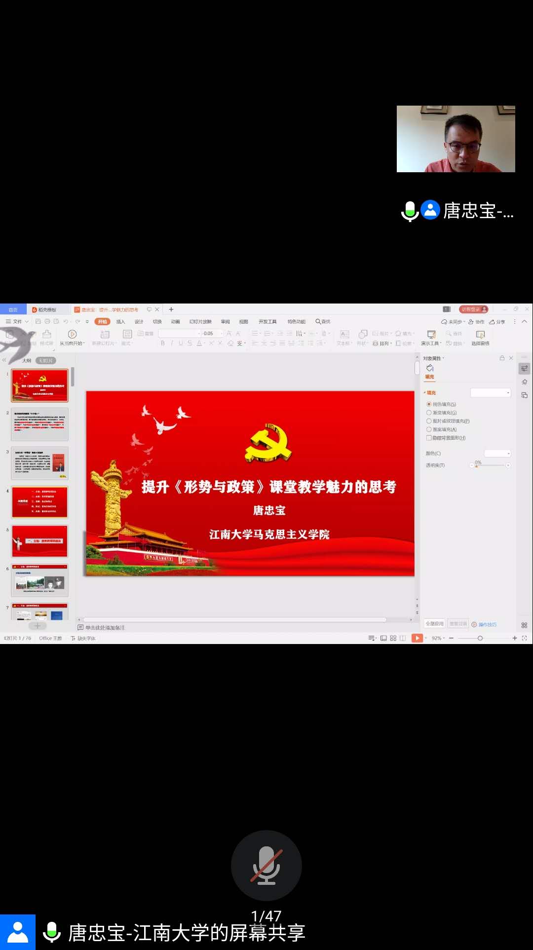 7月7日下午两点半,bat365正版唯一官网“形势与政策”课程组教师通过腾讯会议参加了由内蒙古师范大学主办的内蒙古思政课教师同备一门课——形势与政策课线上集体备课活动。本次活动聘请了江南大学bat365正版唯一官网教授、哲学博士,教育部首批思政工作精品项目“宝哥说”思政文化育人品牌主讲人唐忠宝教授作了题为“提升《形势与政策》课堂教学魅力的思考”的精彩讲座。