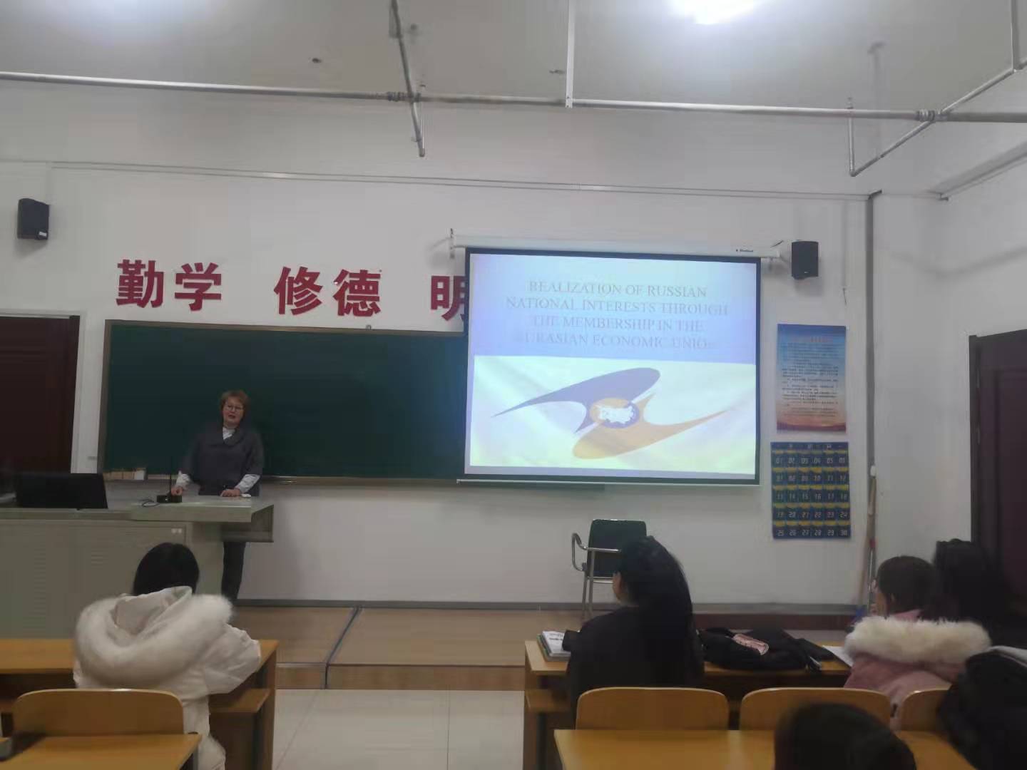 讲座围绕欧洲经济联盟历史、欧洲经济联盟成员变迁、俄罗斯在欧洲经济联盟中要达成的目标和俄罗斯在欧洲经济联盟中获益情况这四个部分展开。特拉娜博士全程用英文授课,并且运用了图片、视频、板书等形式深入浅出的讲解俄国在欧洲经济联盟中的地位和现状。讲座内容打开了学生国际问题研究的视野,增强了学生们对世界经济政治与国际关系问题的兴趣。在交流环节中,学生们积极提问,特拉娜博士对问题一一进行了详细的解答,并鼓励学生结合课程内容继续思考研究。