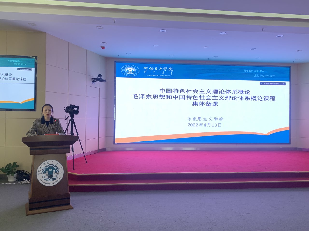 2022年4月13日下午,bat365正版唯一官网开展“中国特色社会主义理论体系概论”“毛泽东思想和中国特色社会主义理论体系概论”课程集体备课活动,活动邀请内蒙古党校(行政学院)政治学教研部主任庄虔友教授进行专题讲授,bat365正版唯一官网全体教师在崇文楼A201观看集体备课活动,院长李俏主持活动。