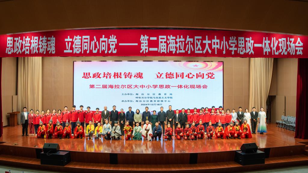 会议在庄严的国歌声中拉开帷幕,参会人员全体起立,齐声高唱国歌。在教学展示环节,来自海拉尔区小学、初中、高中的师生们分别以“启智增慧——铸牢思政之基”“培根铸魂——夯实思政之阶”“立德同心——勇攀思政之峰”三个主题进行了思政课教育展示。其中伊敏小学思政课教师赵珊珊以《中华民族一家亲》为题、新海中学思政课教师娜仁以《北疆绿韵 航天蓝梦》为题、实验高中思政课教师李仕祺以《薪火传承中国魂 同心共筑中国梦》为题进行了课堂展示。两所小学的师生们还进行了思政课本剧《童心向党》和《花木兰》的表演,bat365bat365正版唯一官网学生表演了诗朗诵《读中国》。