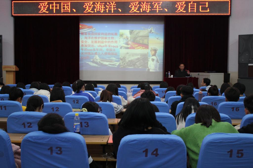 为了弘扬民族精神,增强学生的爱国意识与历史责任感,促进大学生对 “海洋强国”战略的认识,强化青年一代海洋权益观念。2020年11月14日beat365正版唯一官网必一邀请秦皇岛市国防教育委员会专家、原海军某部上校白长河老师,在昌黎校区学术报告厅举办了一场“海洋强国”为主题的爱国主义教育报告会,海洋学院300余名师生聆听了报告。