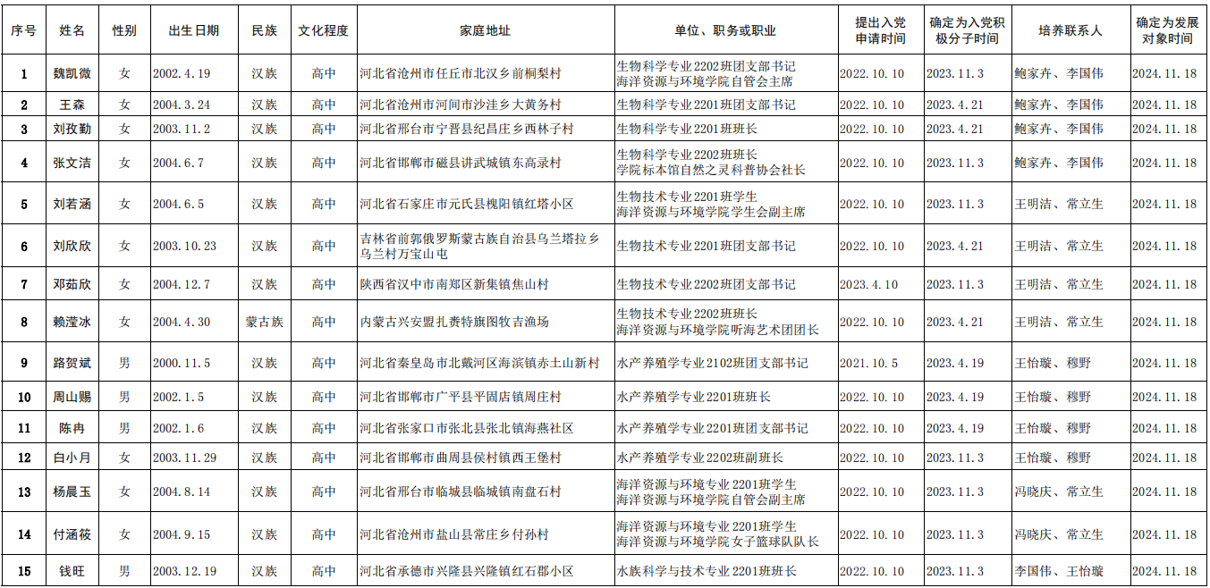 经支部委员会研究,报学院党委备案同意,将魏凯微等15名同志列为发展对象。根据党章和发展党员工作有关要求,现将其有关情况公示如下: