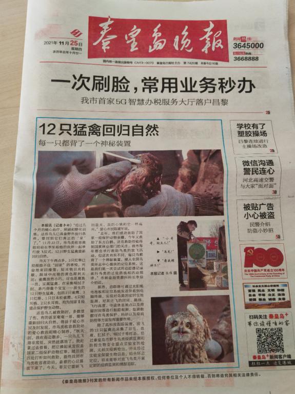 2021年11月25日,《秦皇岛晚报》以《12只猛禽回归自然》为题,报道了beat365杜利强老师参与的秦皇岛鸟类迁徙保护工作,全文如下: