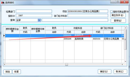 3、进入指标选项,系统根据所选ID号弹出显示1至多条带有经济科目的选项(取决于预算);同时也显示一条无经济科目的空白记录(该记录为合计栏),该条记录不允许选择,选择会显示报错提示。